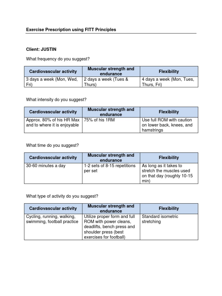 Muscular endurance fitt principle workout plan example pdf. This principle allows you to design a routine that ensures that you are going to achieve a high level of physical fitness by including all the necessary components of fitness. Fitt principles chart fitness and or health benefit variables f frequency i intensity t time t type cardiovascular endurance aerobic 3 to 5 times per week moderate to vigorous intensity 60 to 85 of maximum heart rate minimum of 20 minutes continuous motion of large muscle group s such as running cycling xc cross skiing. The fitt principle the fitt principle provides a frameworkyou can follow for developing an effective exercise program. Endurance 12 20 reps 2 3 sets strength 2 6 reps 3 5 sets 30 sec to 1 minute 30 sec to 1 minute 2 to 5 minutes note.